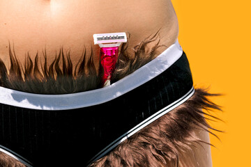 hip , waist navel piercing of young fitness model in red underpants closeup colorful background.hairy bikini area woman epilation, lacer hair removal depilation summer season on the beach shugaring