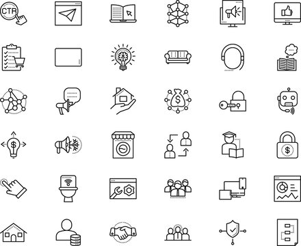 business vector icon set such as: checklist, selection, news, label, gear, class, viral, comfortable, keyhole, robot, door, chatterbot, research, password, relationship, rich, sourcing, tax