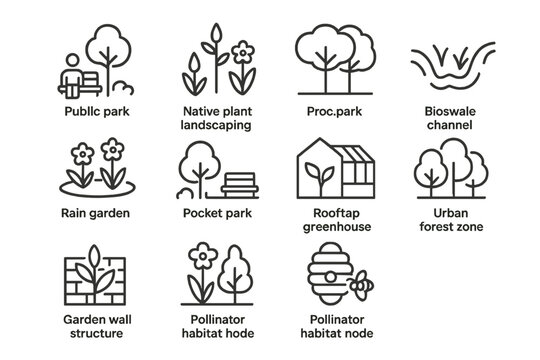 Park icon set. Containing forest, barbecue, camp, bench, picnic and playground icons. Park leisure and outdoor activity symbols. Solid icon collection.