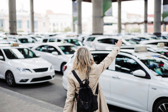 Woman with backpack calling taxi at train station