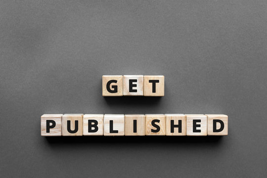 Get published - words from wooden blocks with letters, get published concept, top view gray background