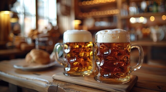 Two glasses of beer sit on wooden table in cozy pub. Warm fireplace burns in background, creating inviting atmosphere for relaxation, social gatherings. Scene captures of traditional tavern, perfect