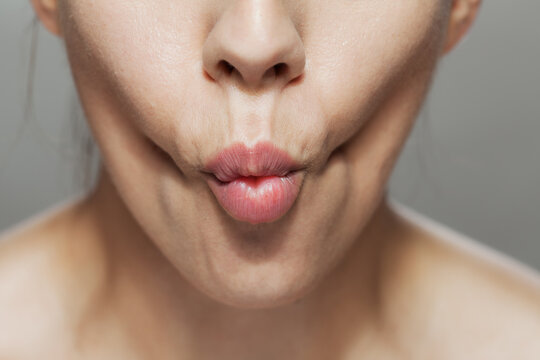 Close-up of a woman making a kiss face, pink lips and natural skin texture