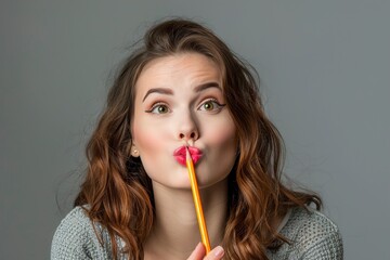 Glamorous woman with red lipstick puckering her lips against a vibrant yellow background. Concepts of beauty, confidence, and striking visual appeal.
