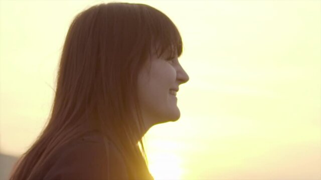 Close-up of playful beautiful young woman puckering against sky at sunset - Thuringia, Germany