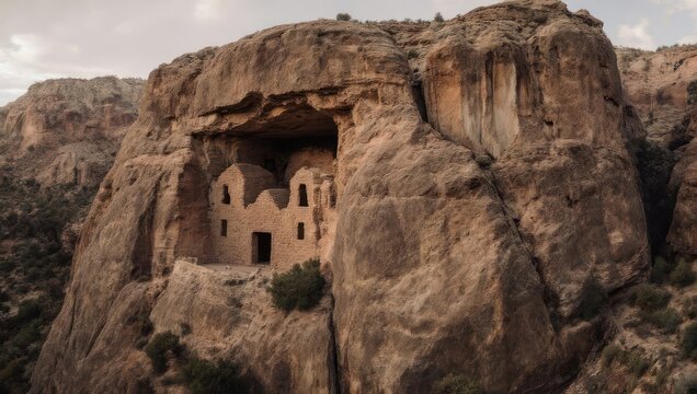 Ancestral puebloan cliff dwelling ruins nestled within a striking desert canyon