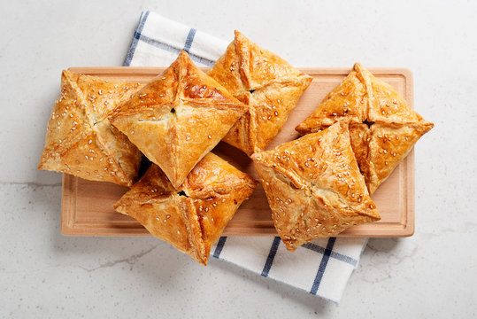 Puff pastry squares filled with potato, cheese and spinach on light gray stone table.top view