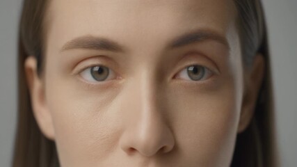 Close-up of mature woman with visible signs of aging, gently touching the skin under her eye while looking into the mirror. Wrinkles and puffiness under the eyes, slow and thoughtful motion