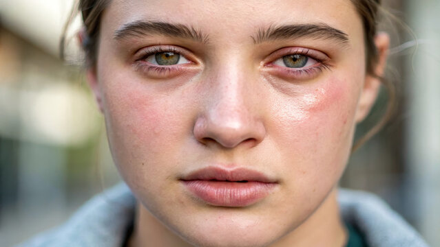 Sinus and Inflammation concept ,young person with swollen face and puffiness around eyes, displaying serious expression