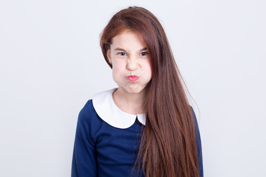 Portrait of a girl who puffed up her cheeks in anger and displeasure while standing on a light background.