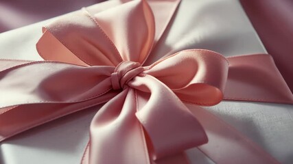 Close-up leading camera pulling back, panning on tabletop, highlighting pink satin bow on gift box
