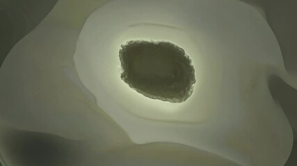 Camera zooms in and rotates around floating, amorphous shapes in muted green, brown, and grey. the shapes pulsate gently, occasionally merging and separating.