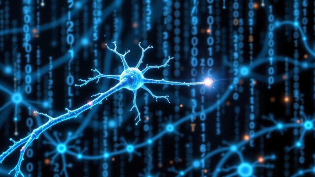 A bioluminescent neuron, pulsating with soft, ethereal light, extends a branching axon into a network of glowing blue nodes