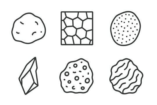 Volcanology Icon Collection. Line style icons of volcanology: igneous rock sample, basalt texture, pumice stone, obsidian shard,