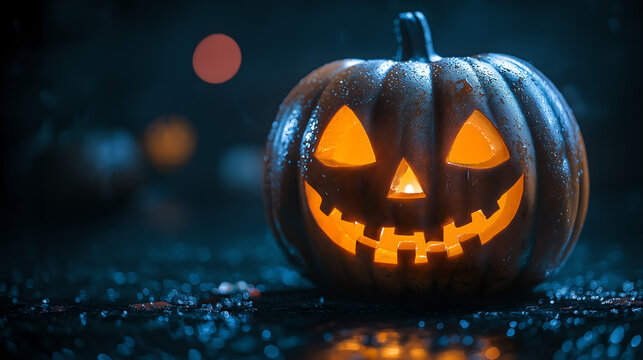 Jack-o'-lanterns with glowing faces amidst halloween ambiance