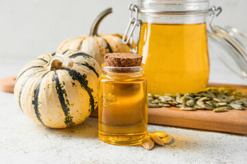 Flat lay composition with pumpkin seed oil in glass pitcher on white wooden table. Space for text