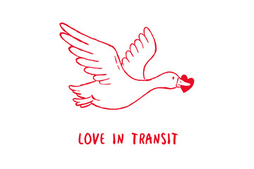 Love in Transit" Hand drawn sketch of a flying goose carrying a red heart for Valentine T Shirt Design