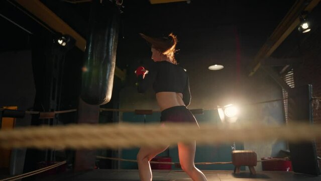 Woman boxer practicing punches in punching bag in gym on boxing ring, bottom view. Young focused girl professional fighter has hard training, full height. Workout, box, sport fighting concept.