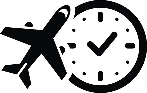 Airplane and clock icon, flight schedule symbol, travel planning vector, aviation time management graphic, punctuality illustration, black silhouette design, booking confirmation artwork