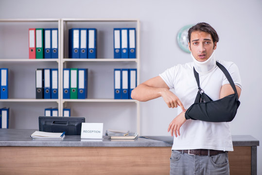 Young man at hospital reception desk