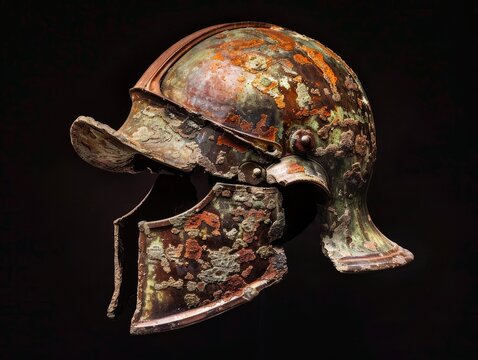A meticulously preserved Roman legionary helmet recovered from a Punic Wars battlefield, showcasing intricate details and battle scars. The patina of age lends an air of authenticity to the artifact,