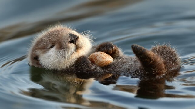 Cute sea otter pup floats, holds shell