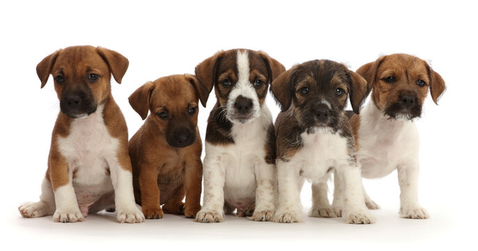 Five Jack Russell x Border Terrier puppies, sitting.