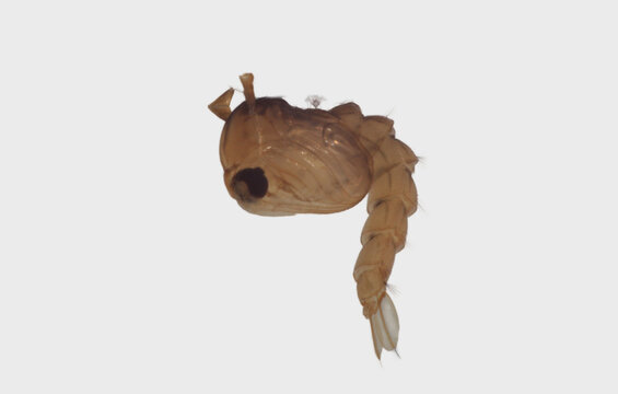 Macro of  mosquito pupa  of   the Dengue vector mosquito (Aedes aegypti) on a white background.