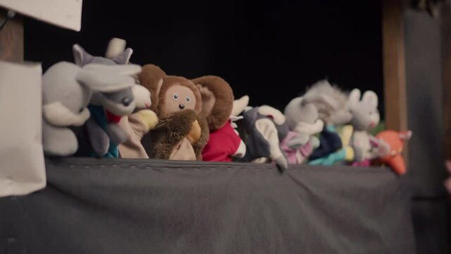 Creative puppet show on stage with decorations and red curtains