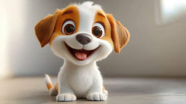 3d cartoon illustration of adorable puppy with big expressive eyes smiling cheerfully against white room background, dog, pet, domestic animal, friend, character, canine, breed, baby
