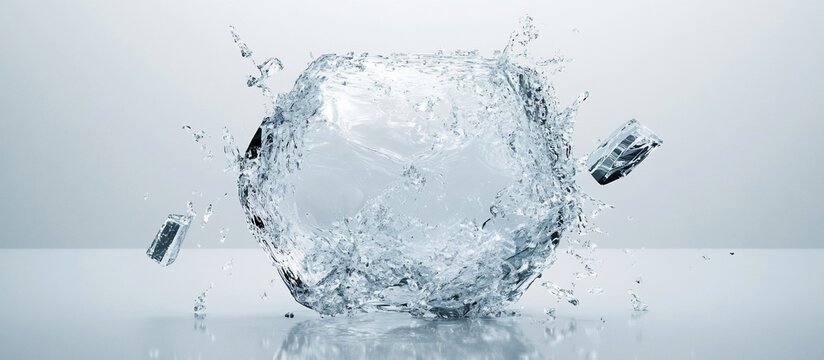 Water sphere explodes, fragments fly, studio backdrop, purity ad