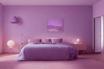 Cute Cozy Dreamy Mid Century Modern Primary Bedroom Interior with monochromatic purple accent wall wood accents mockup frame minimal staged furniture made with Generative Ai