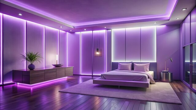 Modern bedroom interior design with purple accent lighting and minimalist furniture