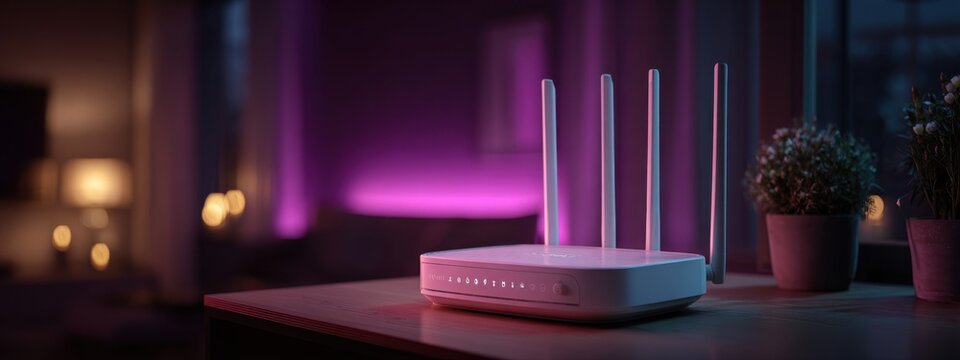 Sleek modern WiFi router providing fast internet connectivity in stylish home setting with vibrant purple accent lighting for seamless streaming and work