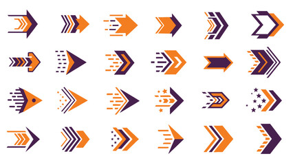 A collection of various orange and purple arrow icons, representing direction, movement, and progress, displayed in a grid layout on a white background.