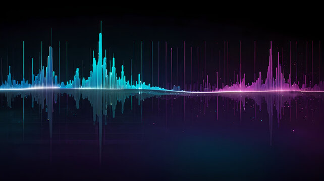 Vibrant digital audio spectrum analyzer with glowing blue and purple bars visualizing music frequency waves on a dark background