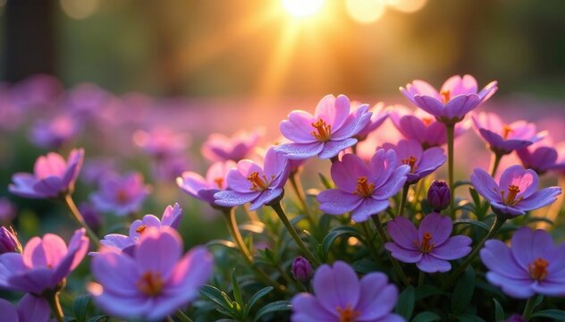 Softly falls the evening dew on Surfinia purple flowers, nature, flower field