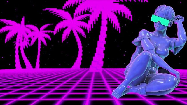 A purple grid background with stars in the sky, a retro neon light effect on a black space