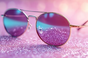 Stylish aviator sunglasses with gradient purple lenses on sparkling glitter surface. Fashion accessory for summer vacation, trendy eyewear design concept.