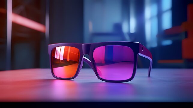 A pair of pink sunglasses with blue and purple lenses is displayed against a purple background with pink and blue lights