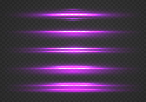 Glowing purple light stars with sparkles. Horizontal lens flares pack. Laser beams, light rays. Beautiful light flares. Glowing streaks on transparent background. Luminous abstract wallpaper
