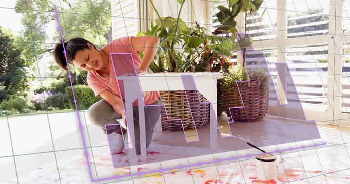 Mature woman spotting paint spill, cleaning table on porch, purple overlay sweeping over woman DIY