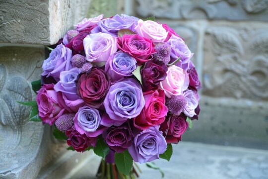 A bunch of purple roses sitting on top of a white surface. Generative AI.