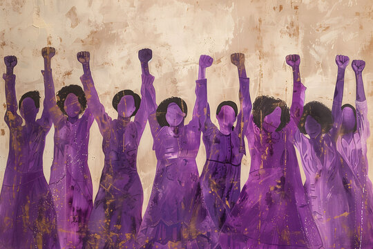 International Women's Day. Illustration of the purple silhouette of a group of women with their fists raised in protest. Concept protest for rights and equality.