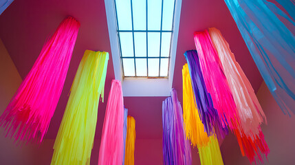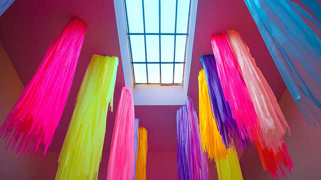 Vibrant ceiling decoration with colorful fabric strips hanging beneath a skylight for an artistic display.