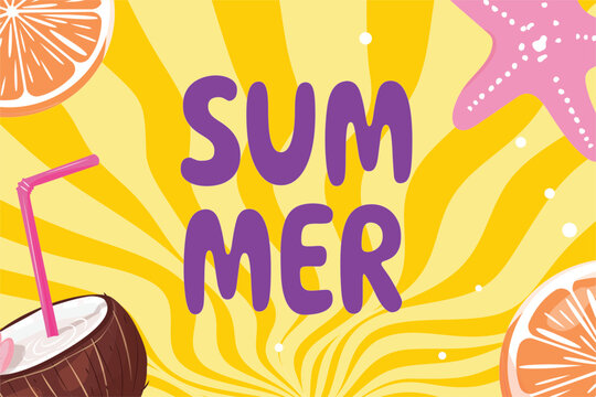 Fun summer illustration, coconut drink, citrus slices, starfish, wavy yellow pattern, bold purple text