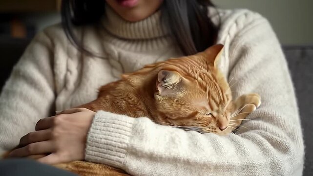 A heartwarming close-up of a cat purring and kneading on a person's soft sweater.