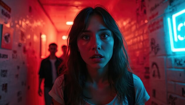 Woman runs from pursuers down narrow neon lit corridor. She looks scared, seeking escape from danger. Intense thriller atmosphere in urban setting.