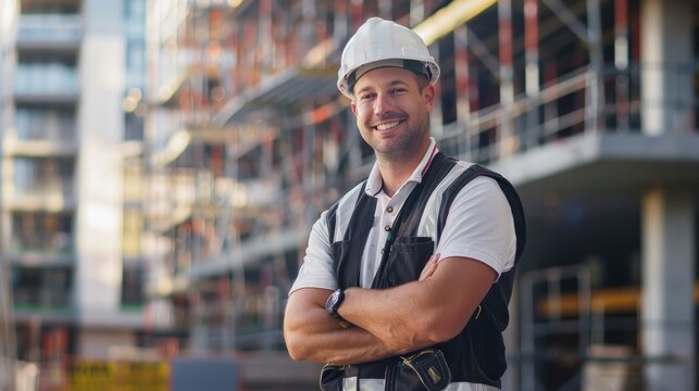 Architect male, outside photo, arms crossed, smiling, and property development vision. Engineer, architect, and pursuer of pleasure, buildings, and professional aspirations