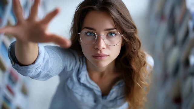 Woman reaching for knowledge in a library while pursuing personal growth and adult education during daylight hours